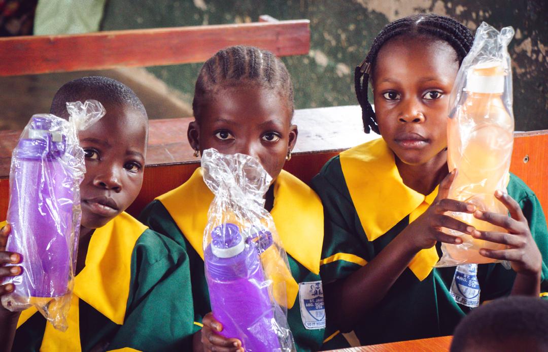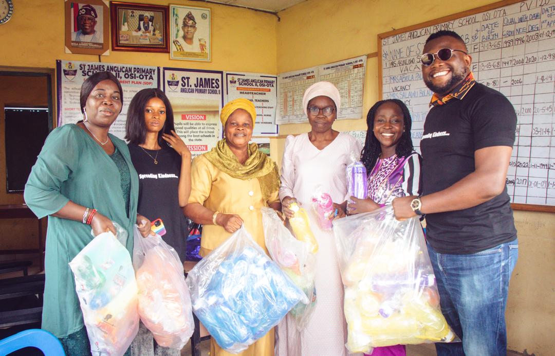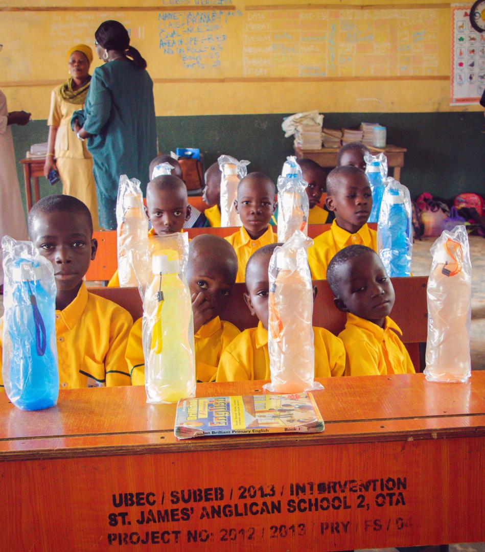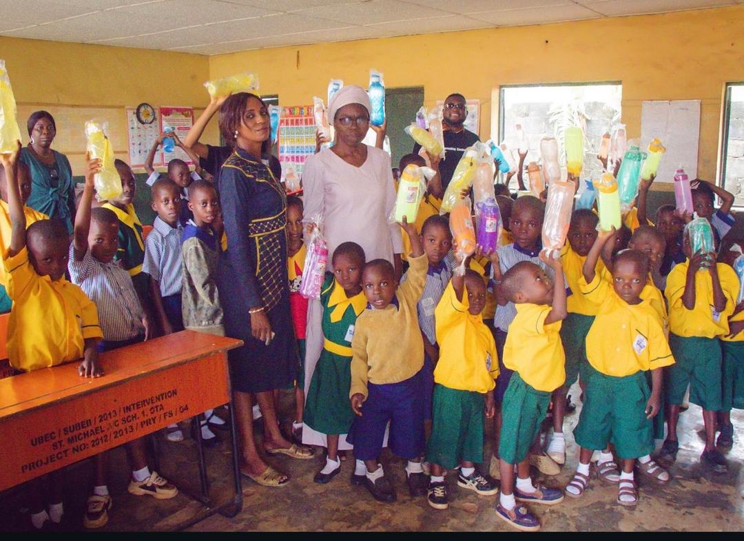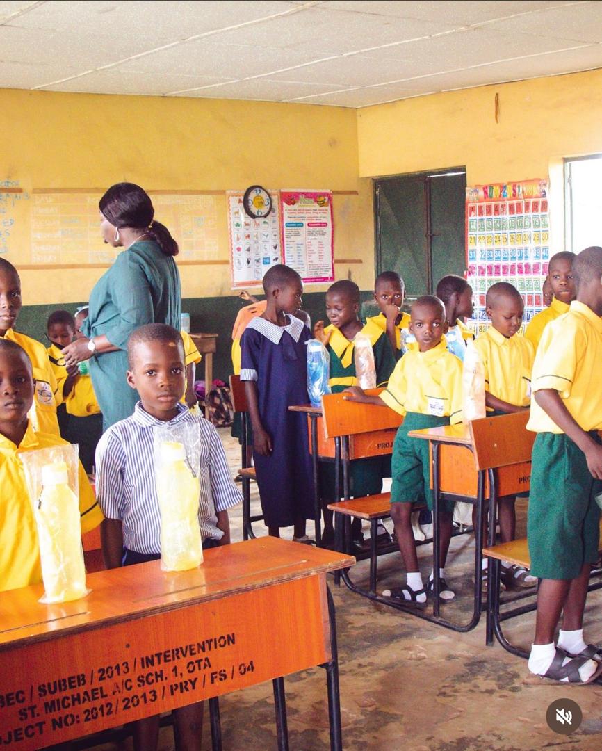 Tables and chairs were donated by mohcute charity organization to the pupils of St James Anglican Primary school Ota . as some pupils were seating on the on the floor to learn .